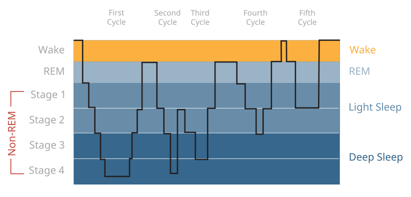 Um definieren zu können, was einen guten Schlaf ausmacht, müssen zuerst die verschiedenen Phasen des Schlafes betrachtet werden. Unser Schlaf verläuft nicht gleichmässig, sondern in wiederkehrenden Zyklen, die etwa 90 Minuten dauern. Jeder Schlafzyklus besteht aus mehreren Phasen, die sich in ihrer Tiefe und Funktion unterscheiden: